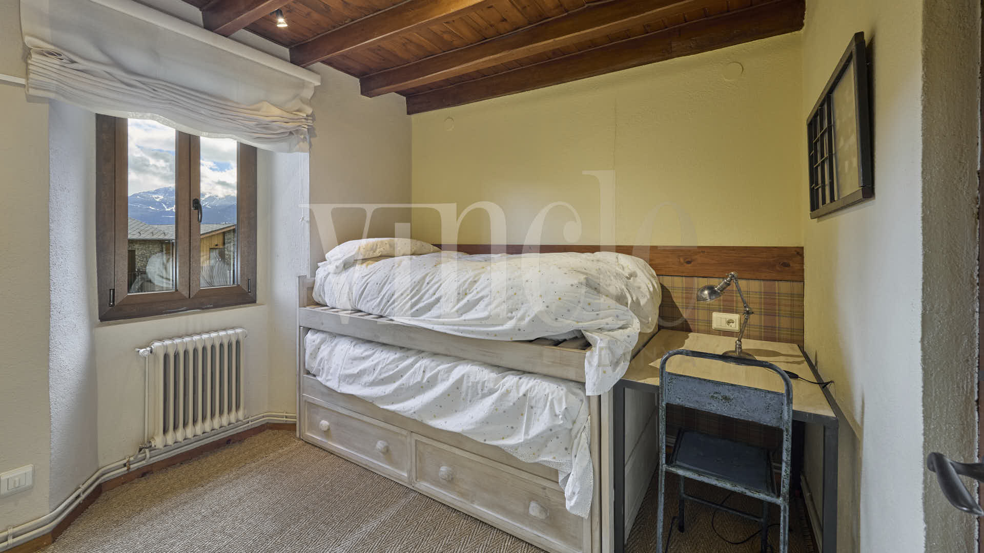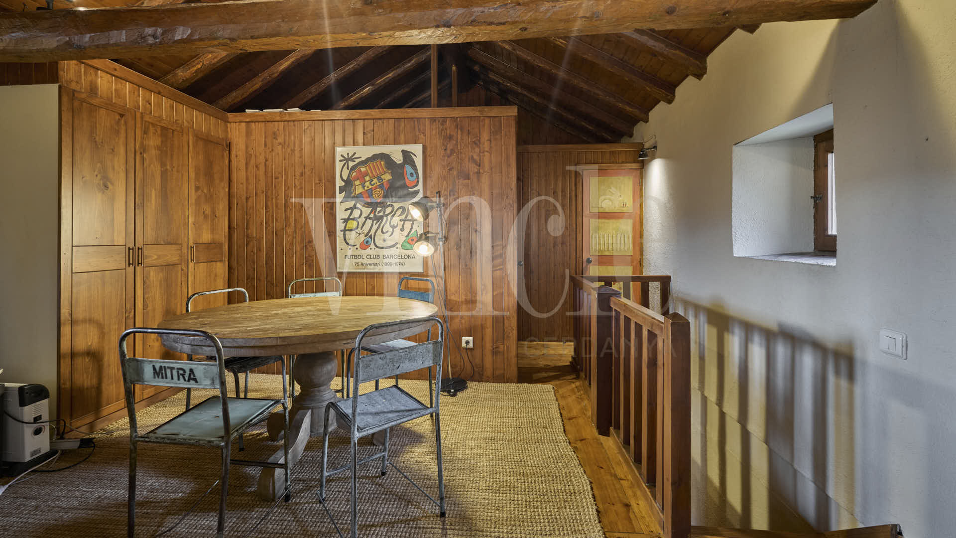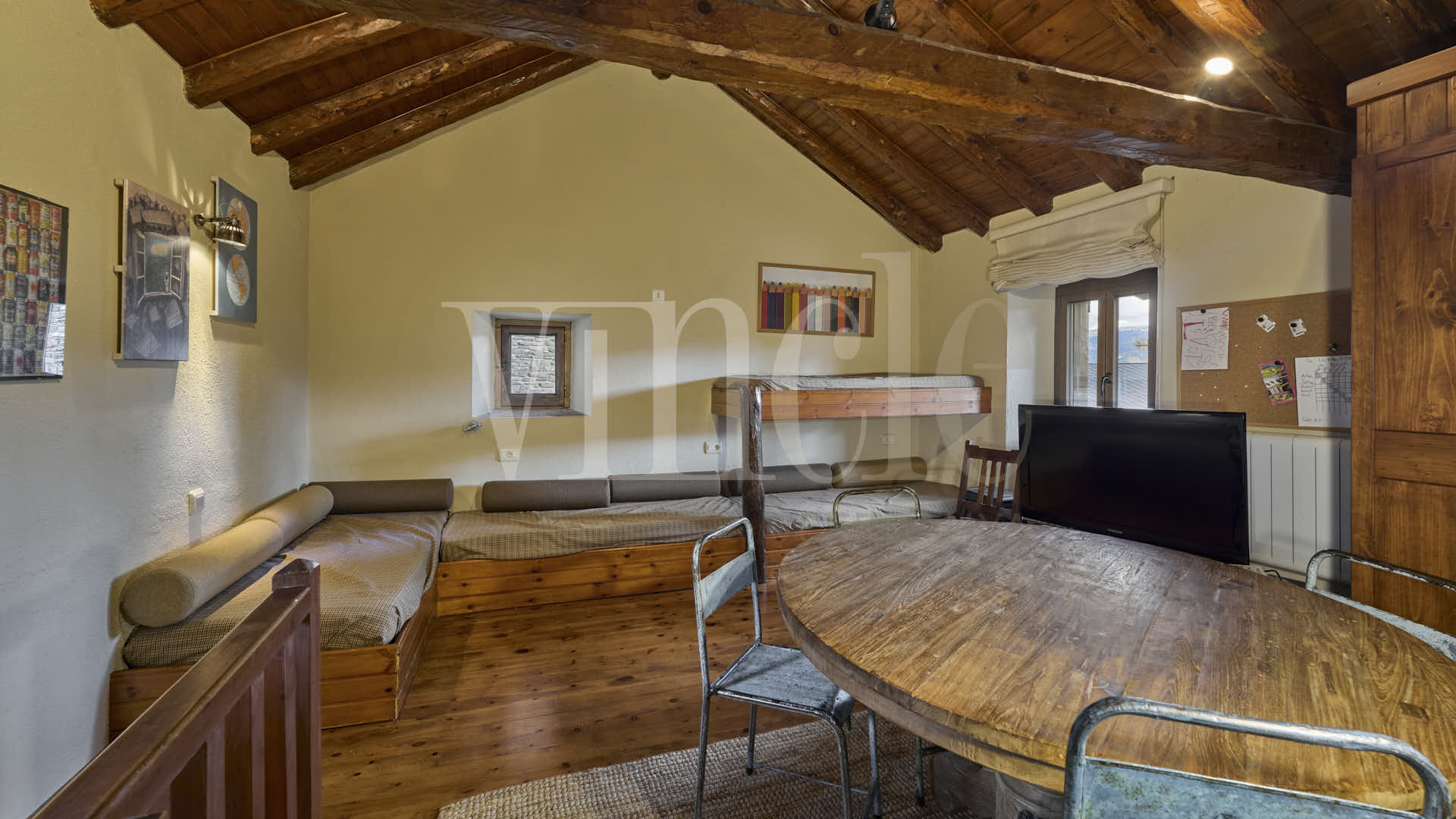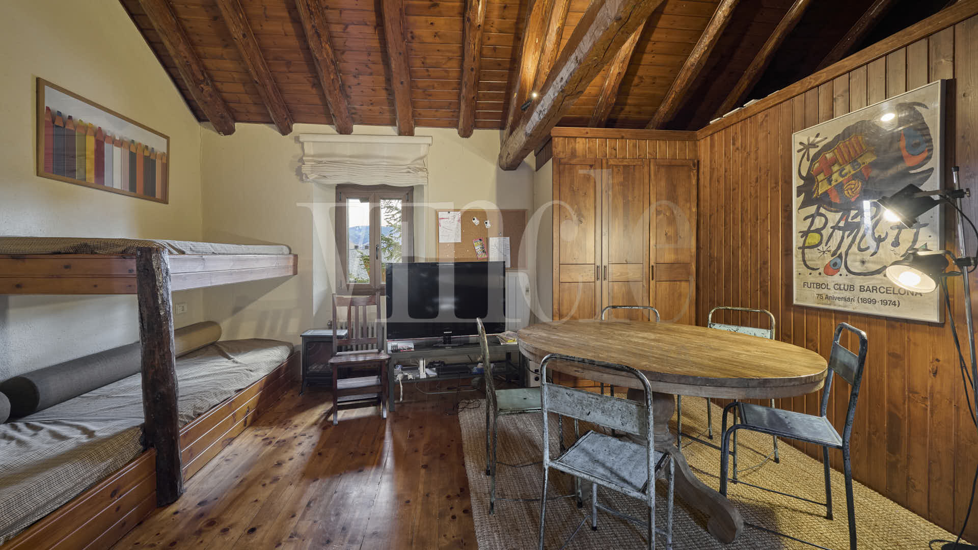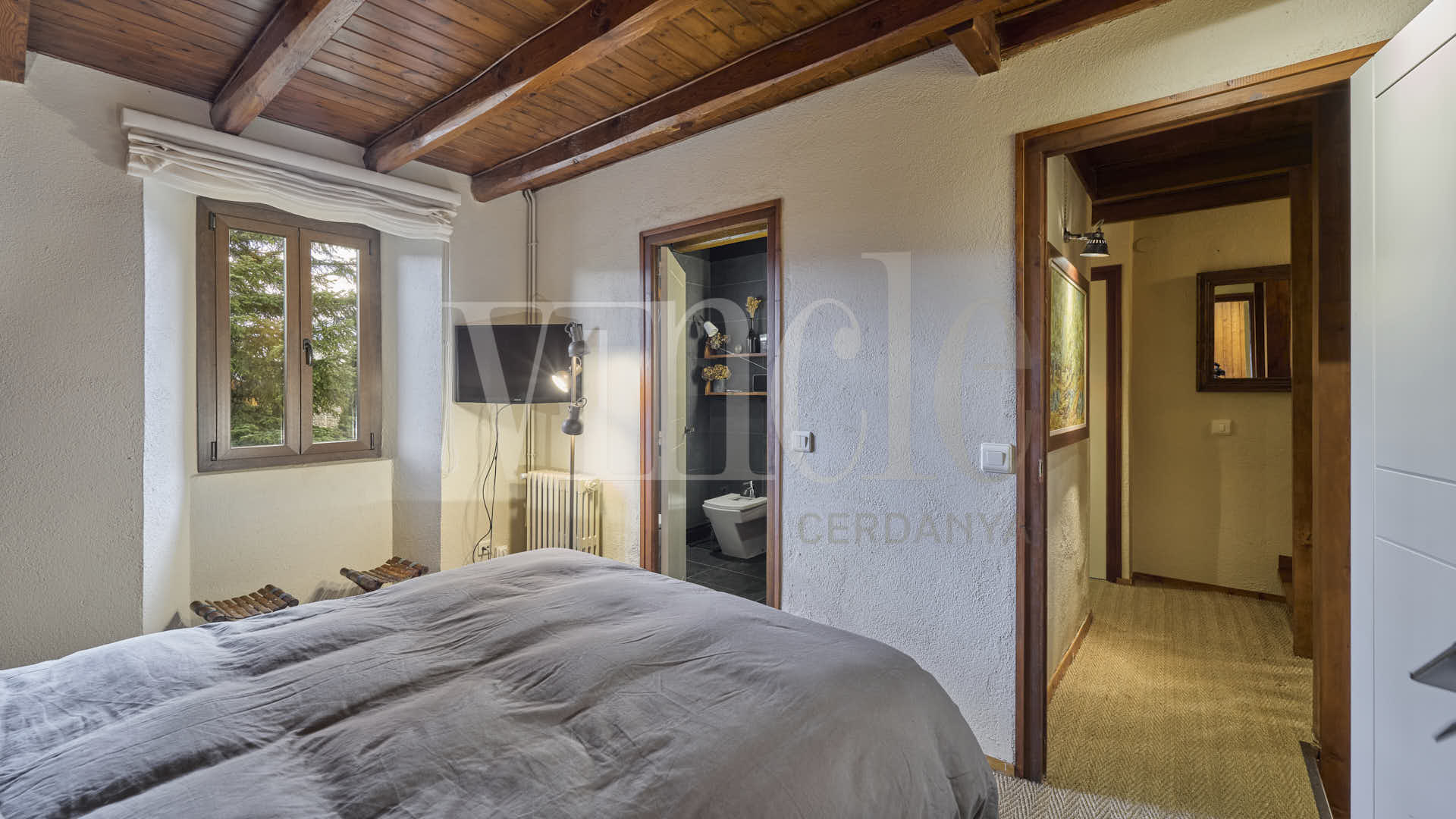En la planta superior, una agradable sala de estar con encanto, presidida por sus espectaculares vigas de madera, aporta calidez y personalidad a la vivienda. La zona de noche dispone de dos habitaciones dobles, una de ellas especialmente amplia, con múltiples posibilidades de uso como sala polivalente, despacho o zona de juegos, un baño compartido y dos suites.
