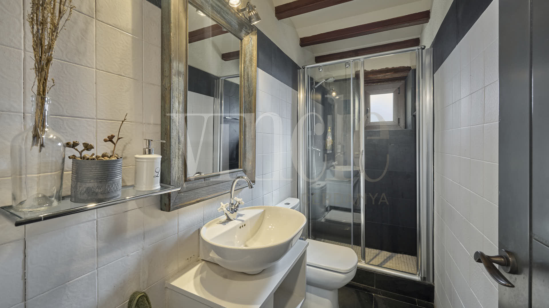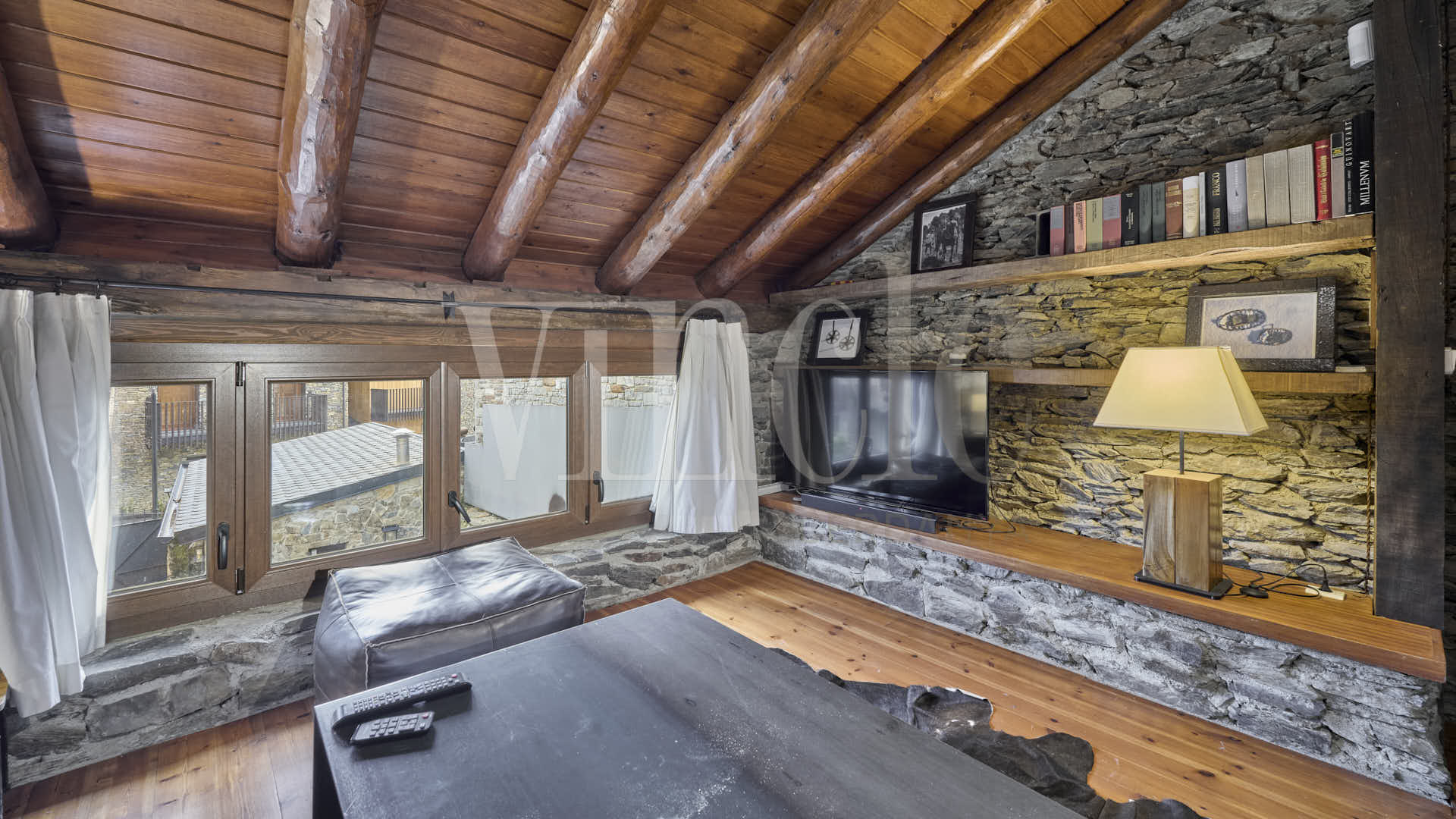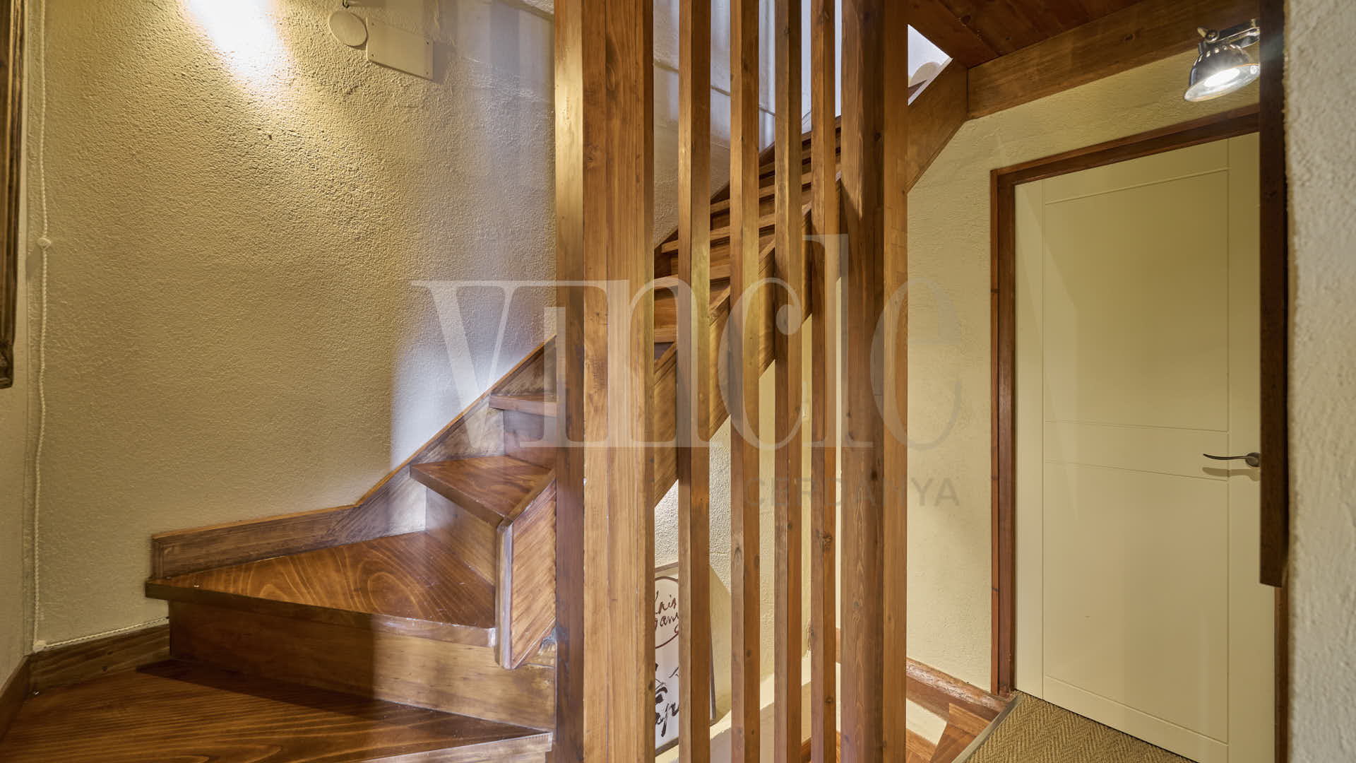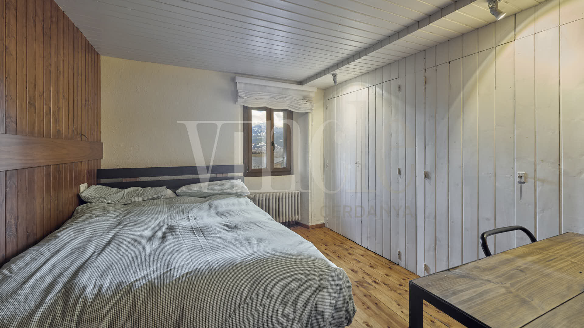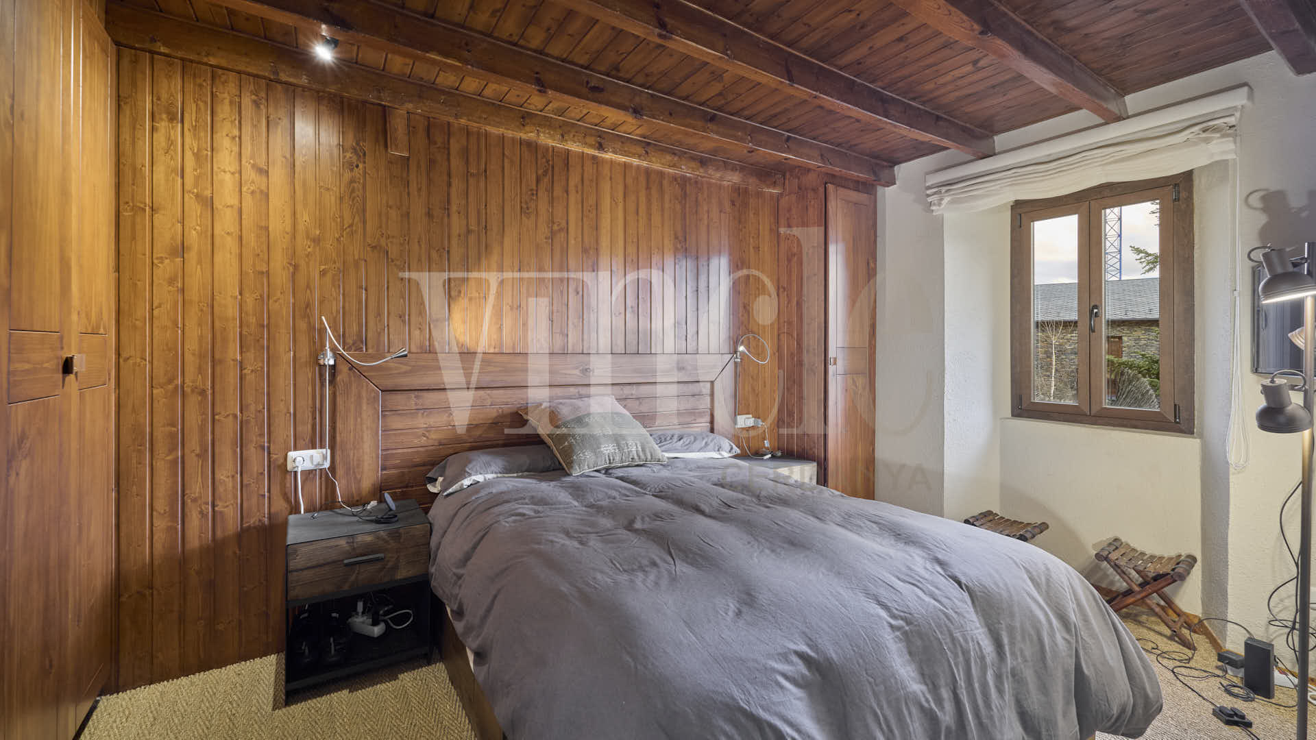 En la planta superior, una agradable sala de estar con encanto, presidida por sus espectaculares vigas de madera, aporta calidez y personalidad a la vivienda. La zona de noche dispone de dos habitaciones dobles, una de ellas especialmente amplia, con múltiples posibilidades de uso como sala polivalente, despacho o zona de juegos, un baño compartido y dos suites.