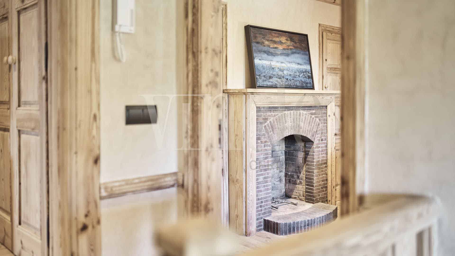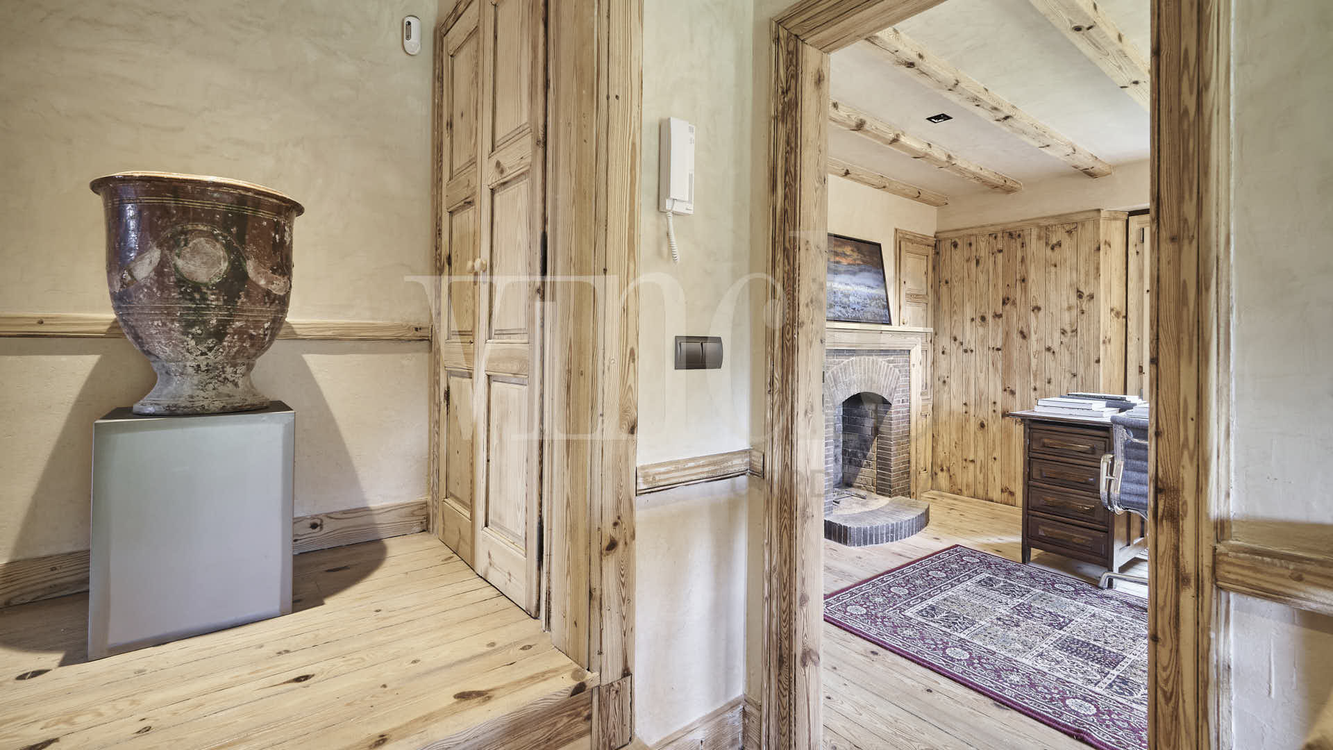 Desde el primer momento, la casa transmite calidez y armonía. Accedemos por un amplio recibidor que nos conduce a un impresionante salón con chimenea, presidido por grandes ventanales que dan acceso a una terraza que envuelve toda la fachada principal. Un espacio exterior pensado para gozar del verano, las vistas y el silencio. La zona de comedor, muy luminosa, conecta con una cocina independiente con espacio office, y en esta misma planta encontramos también un aseo de cortesía.