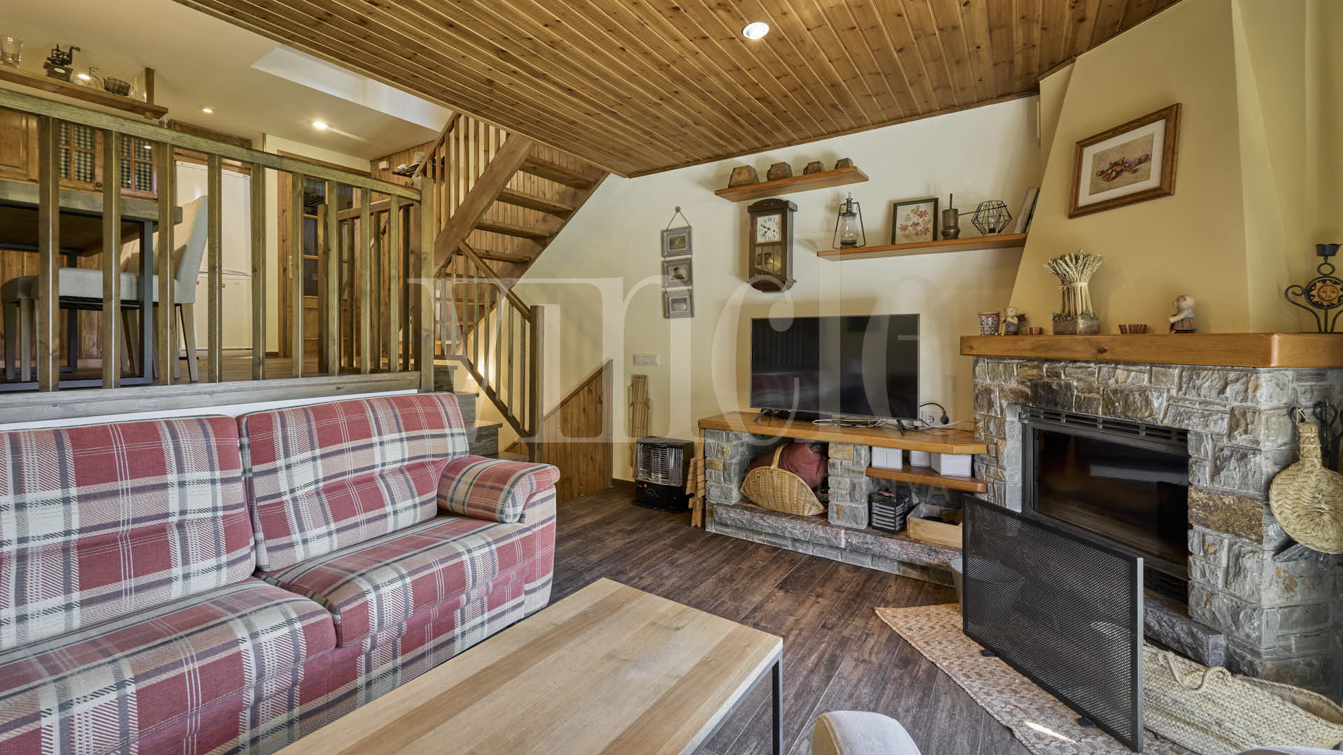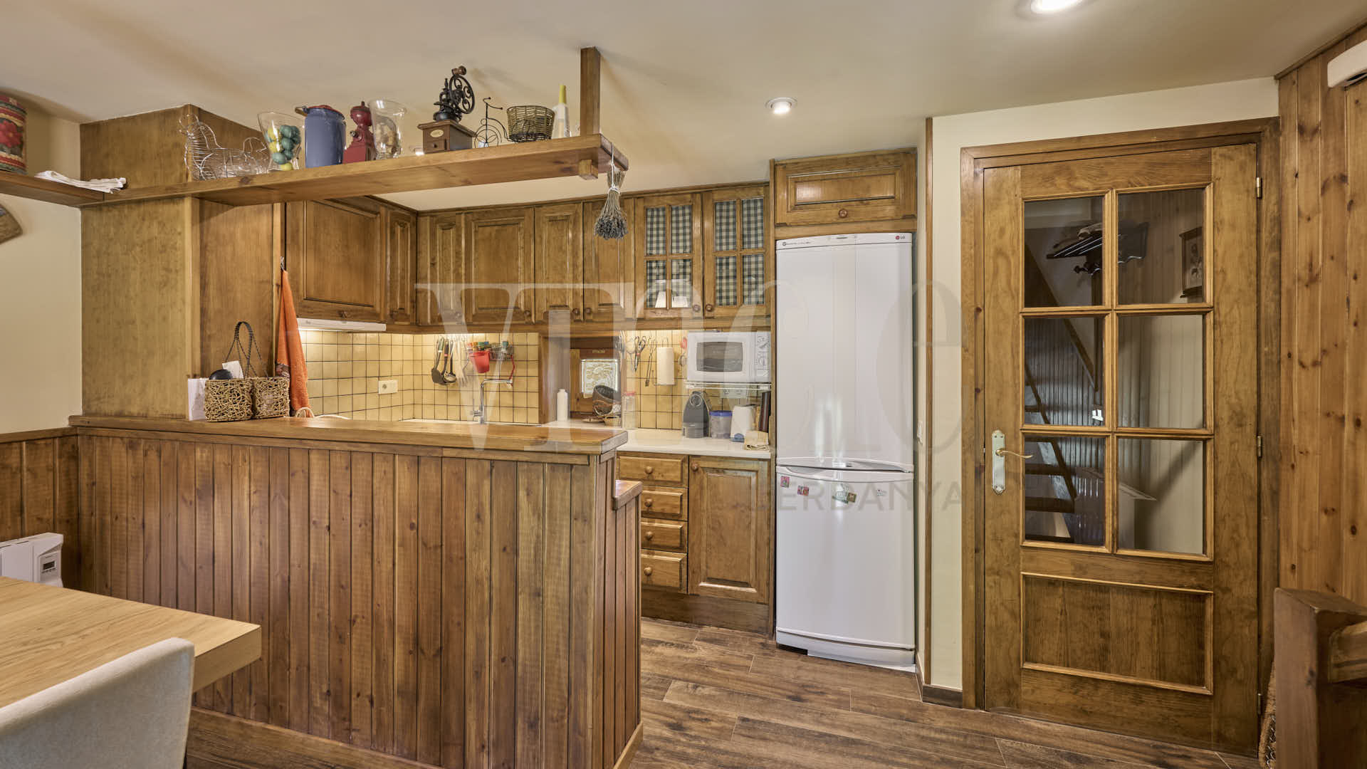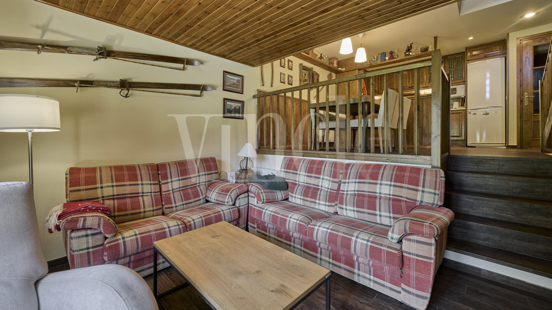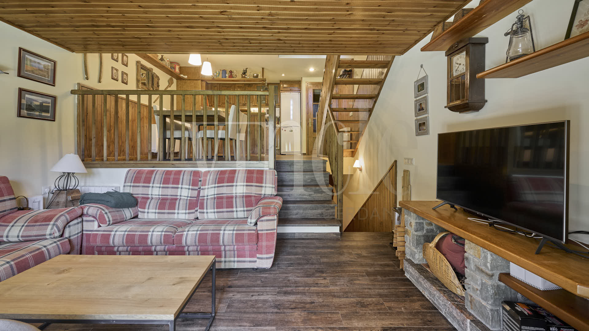 L’habitatge es distribueix en diferents nivells, fet que li aporta un ambient càlid i acollidor. A la zona de dia hi trobem un confortable saló amb llar de foc i sortida a un agradable porxo, un espai de menjador i una cuina oberta totalment equipada, a més d’un bany.