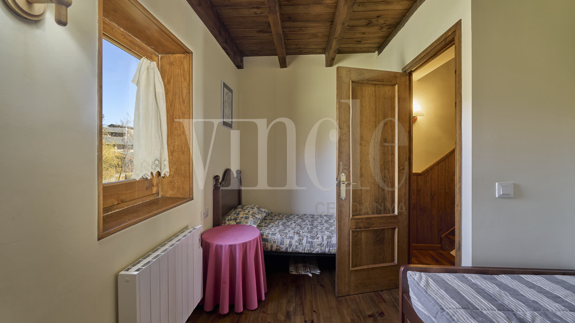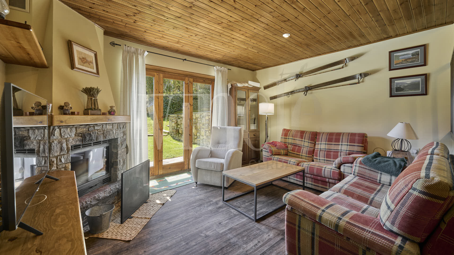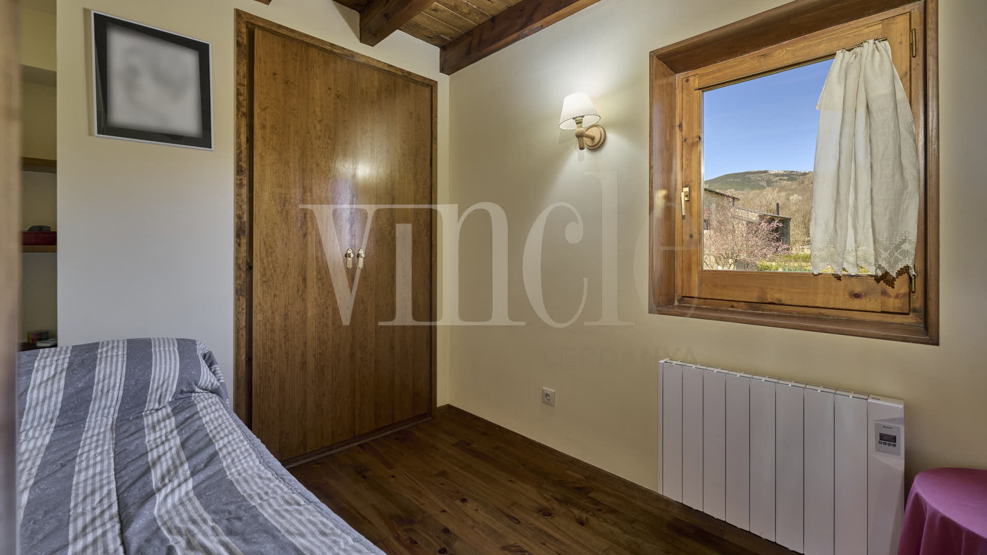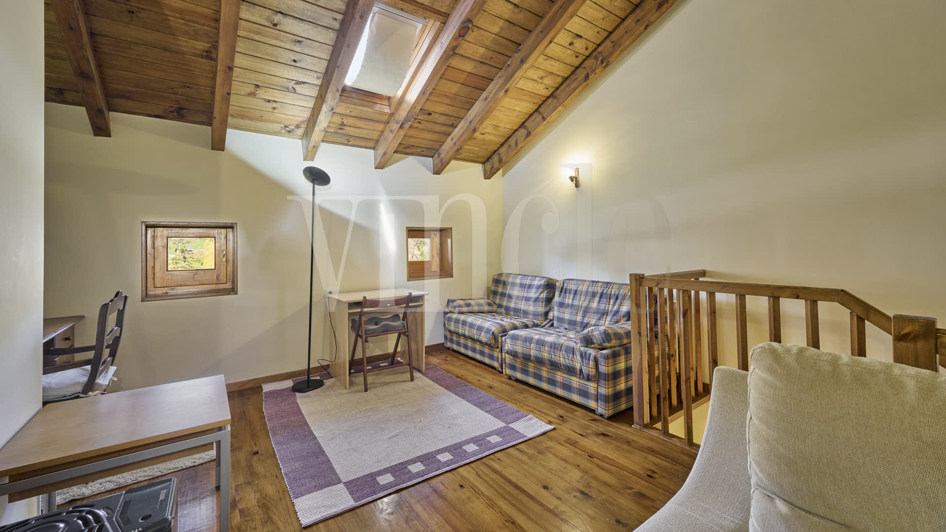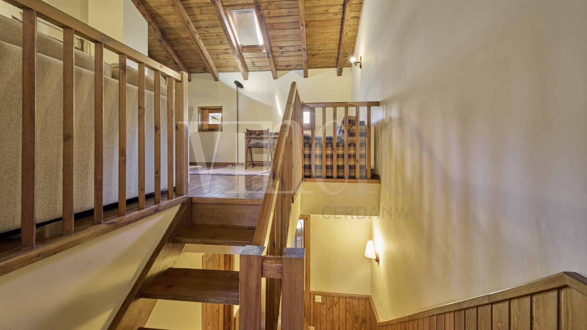 L’habitatge es distribueix en diferents nivells, fet que li aporta un ambient càlid i acollidor. A la zona de dia hi trobem un confortable saló amb llar de foc i sortida a un agradable porxo, un espai de menjador i una cuina oberta totalment equipada, a més d’un bany.