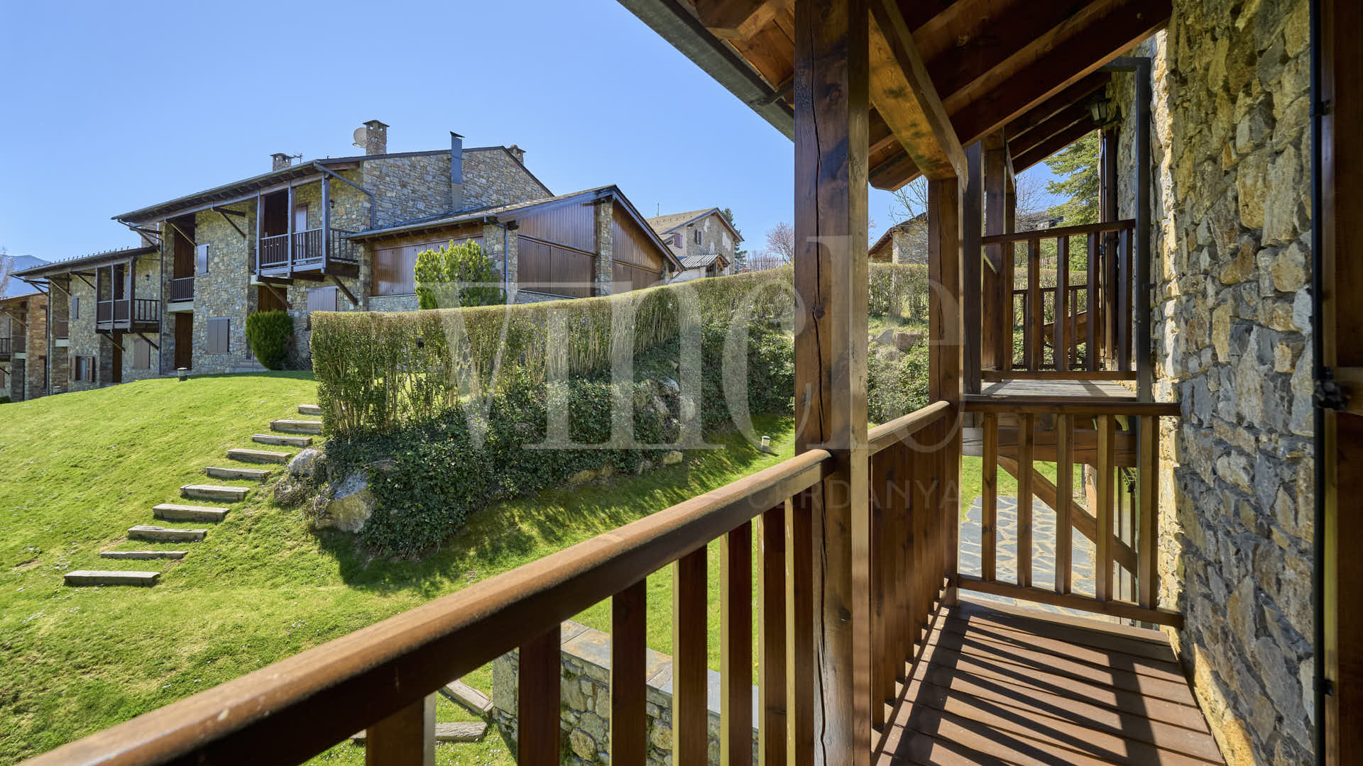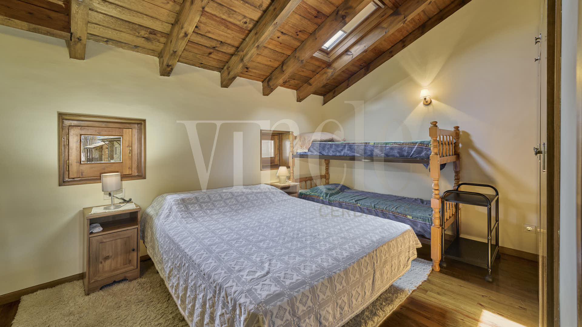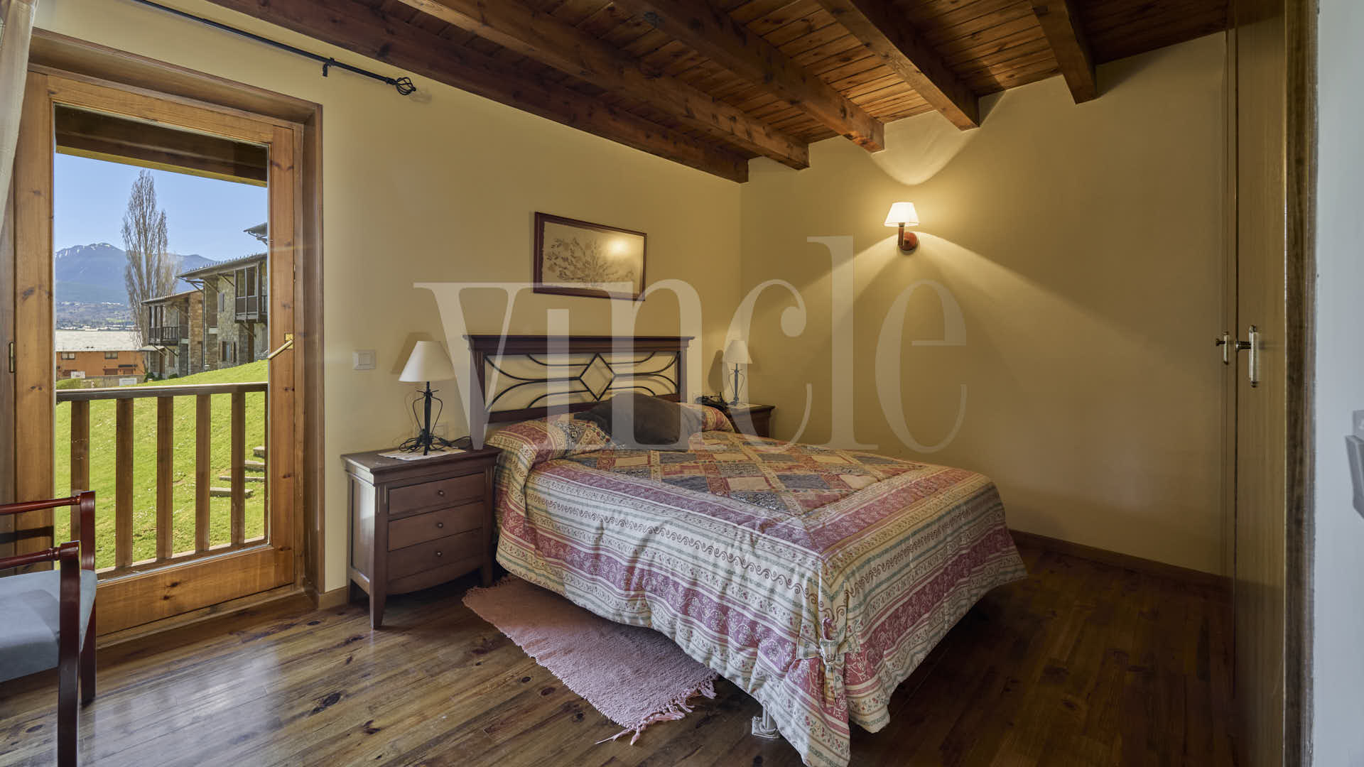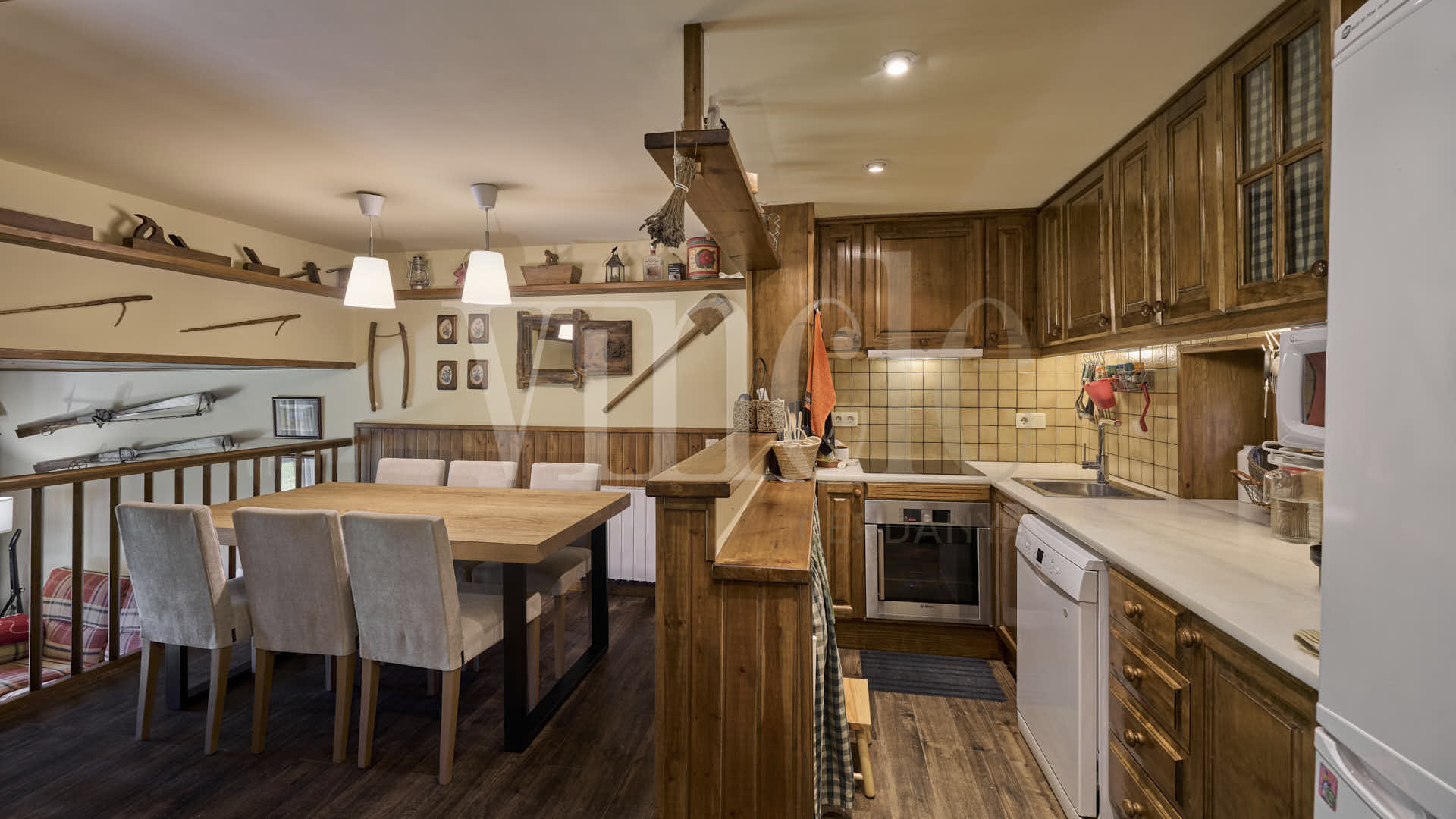 L’habitatge es distribueix en diferents nivells, fet que li aporta un ambient càlid i acollidor. A la zona de dia hi trobem un confortable saló amb llar de foc i sortida a un agradable porxo, un espai de menjador i una cuina oberta totalment equipada, a més d’un bany.