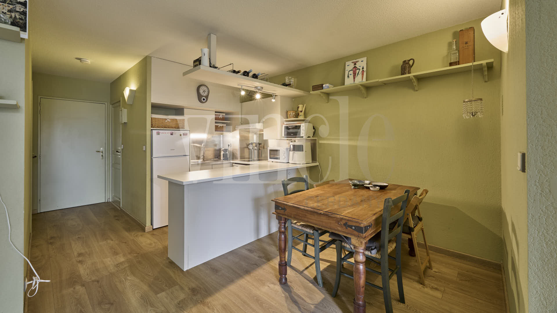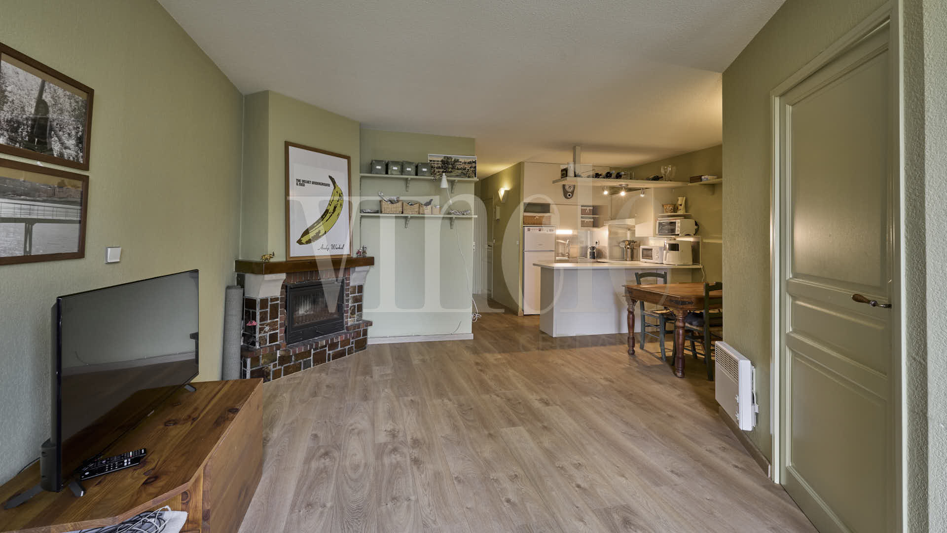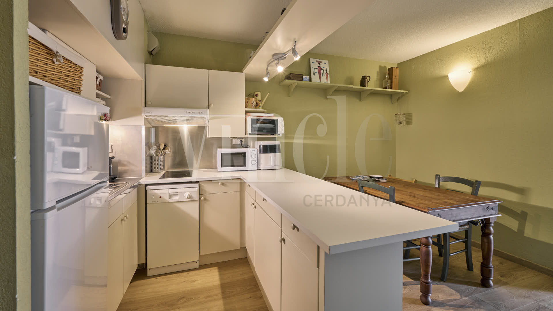 Aquest acollidor apartament ofereix un espai càlid i funcional, amb dues habitacions, bany complet i una cuina oberta integrada al menjador, que aporta amplitud i continuïtat a l’espai. La sala d’estar, lluminosa i confortable, destaca per la seva llar de foc, perfecta per gaudir d’un ambient acollidor durant els mesos d’hivern.