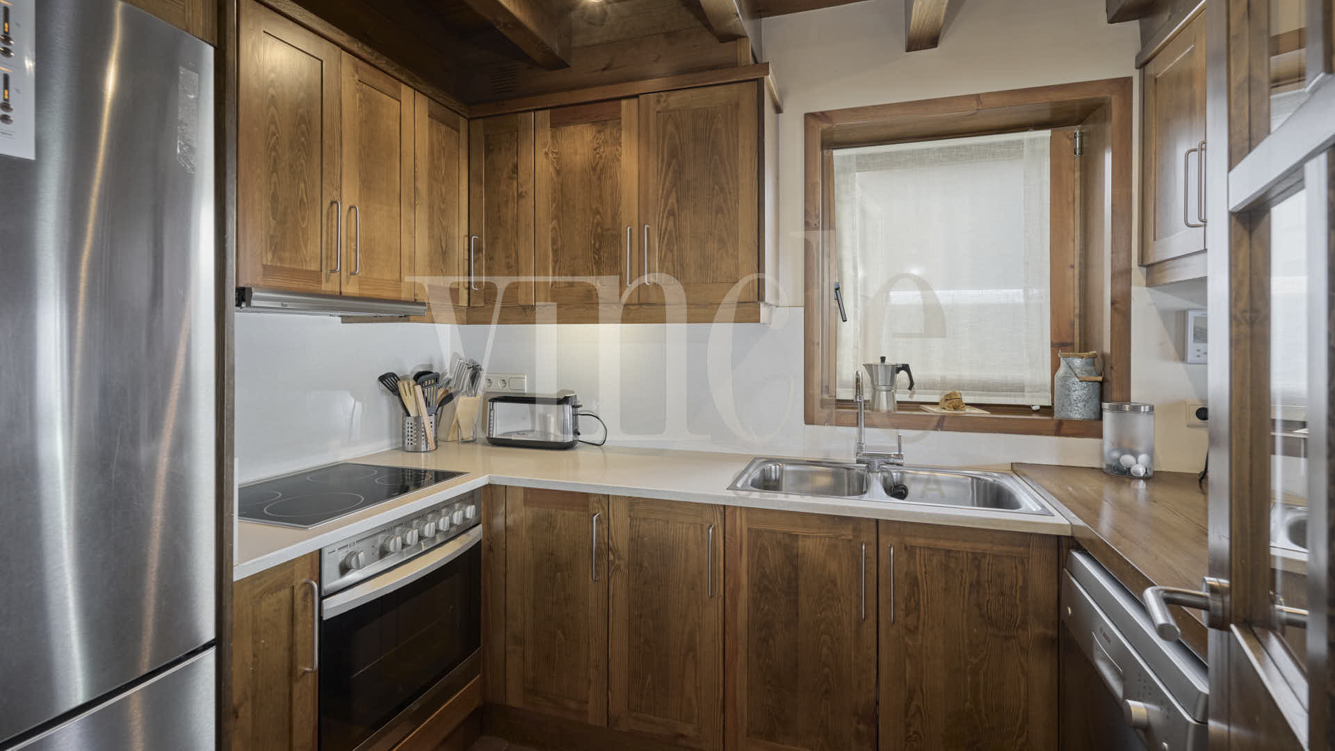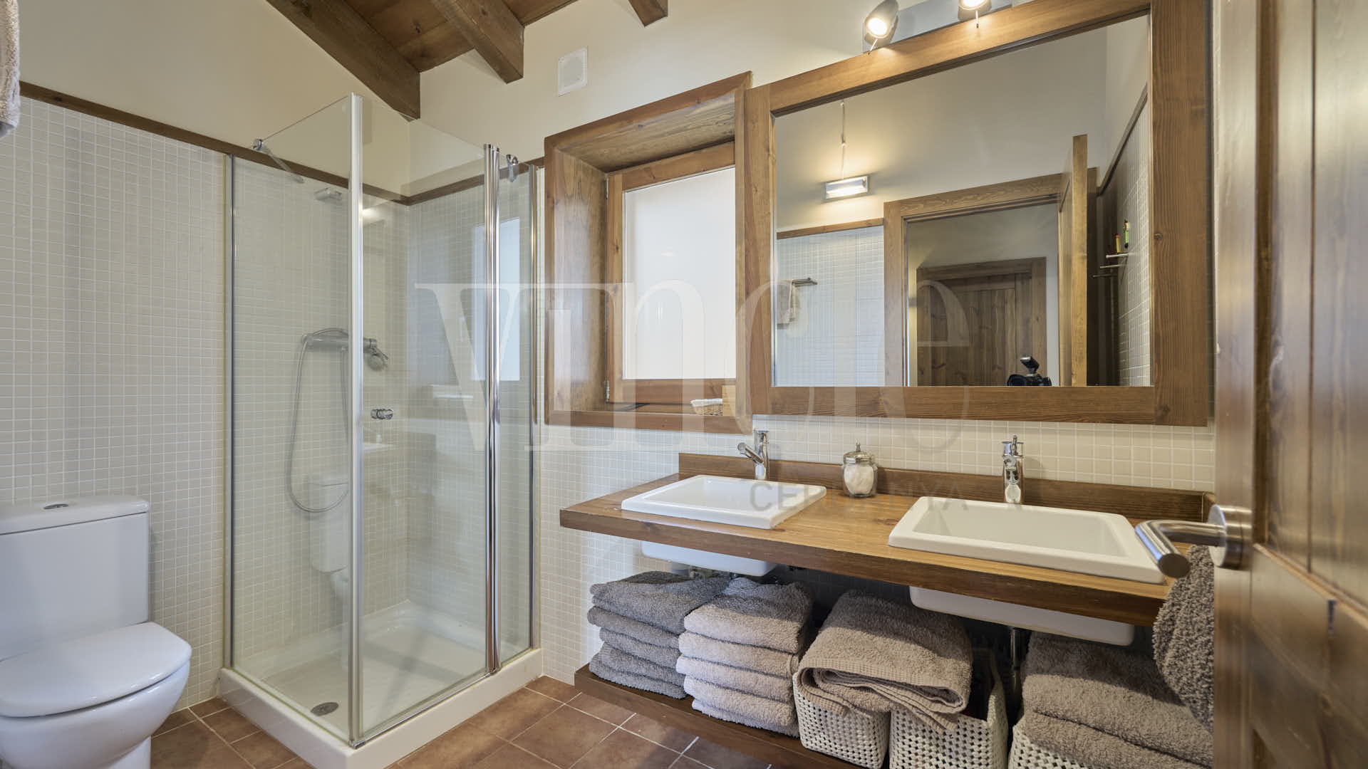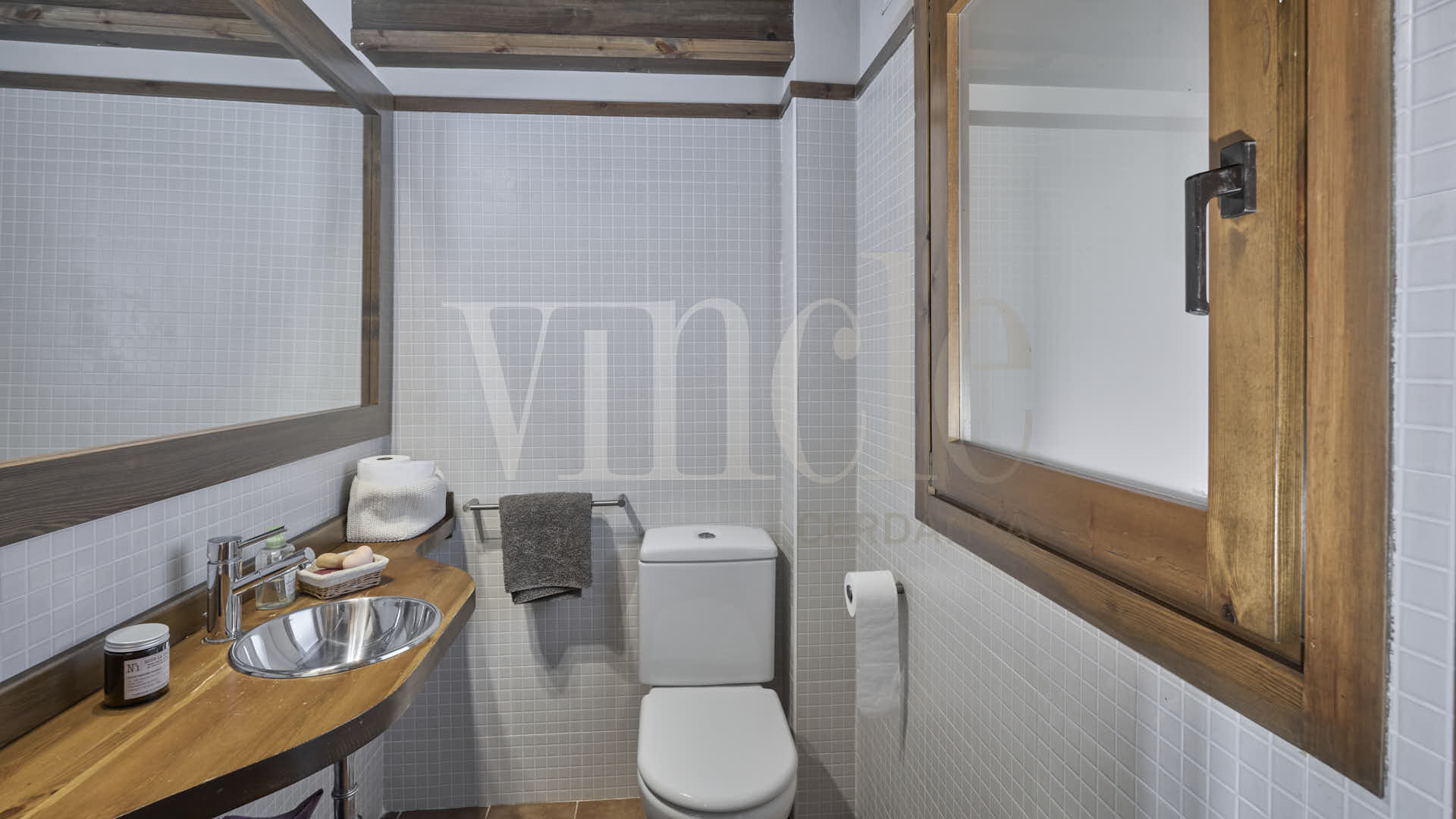 A la planta baixa, trobem una agradable zona de dia formada per una cuina independent totalment equipada, amb pràctic passa-plats, un ampli espai de menjador i un saló d’estil rústic amb una acollidora llar de foc, perfecte per crear un ambient familiar i confortable. Des del saló s’accedeix directament a un encantador porxo i a un jardí privat amb vistes bones, un espai ideal per gaudir de l’exterior durant tot l’any.