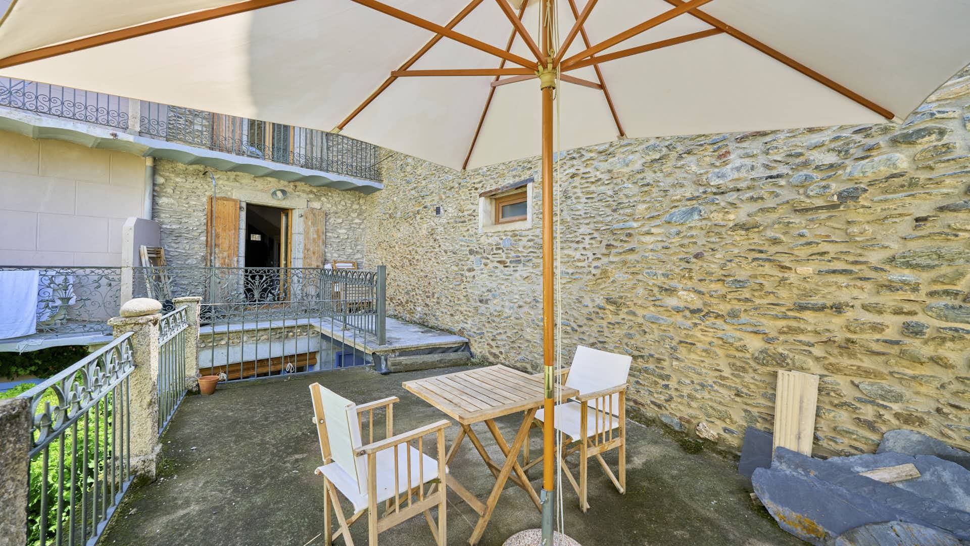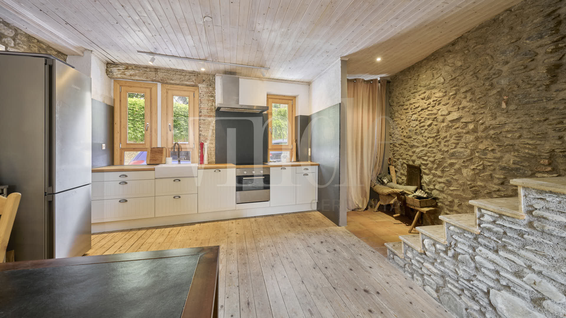 Accedim per la planta baixa, on es desenvolupa la zona de dia. Hi trobem una cuina totalment equipada, pràctica i funcional, oberta a un menjador ampli i a un acollidor saló amb llar de foc, ideal per gaudir de llargues vetllades d’hivern. Des d’aquest espai, s’accedeix a una fabulosa terrassa, perfecta per esmorzar, relaxar-se a la tarda o sopar a la fresca.