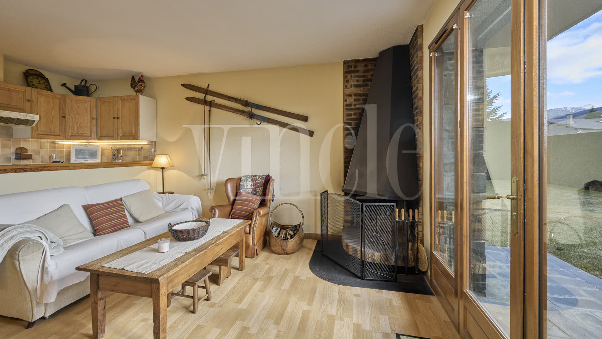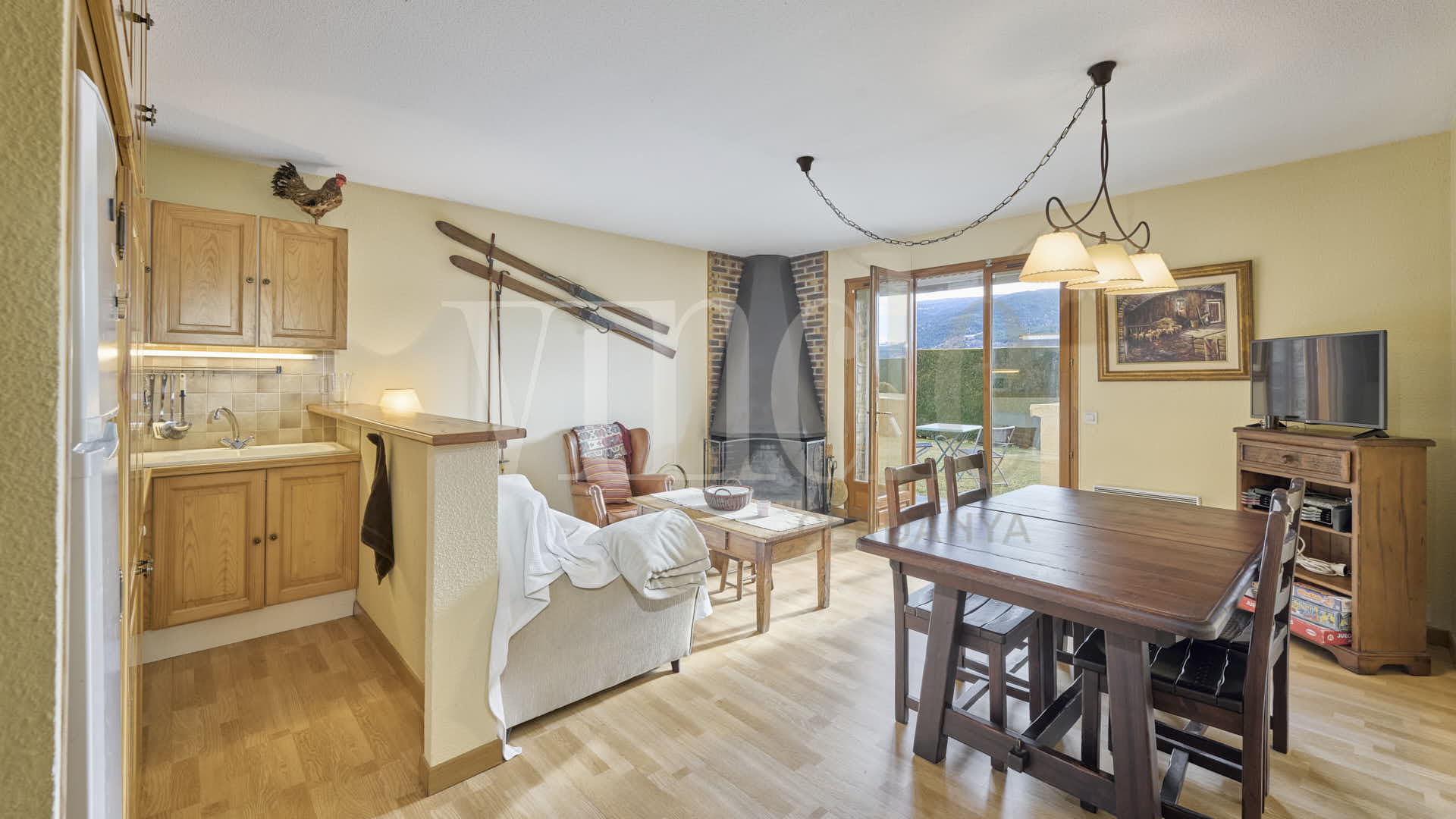 El saló-menjador, amb una acollidora llar de foc, ofereix sortida directa a un agradable porxo, creant un espai perfecte per al descans i la vida quotidiana.
