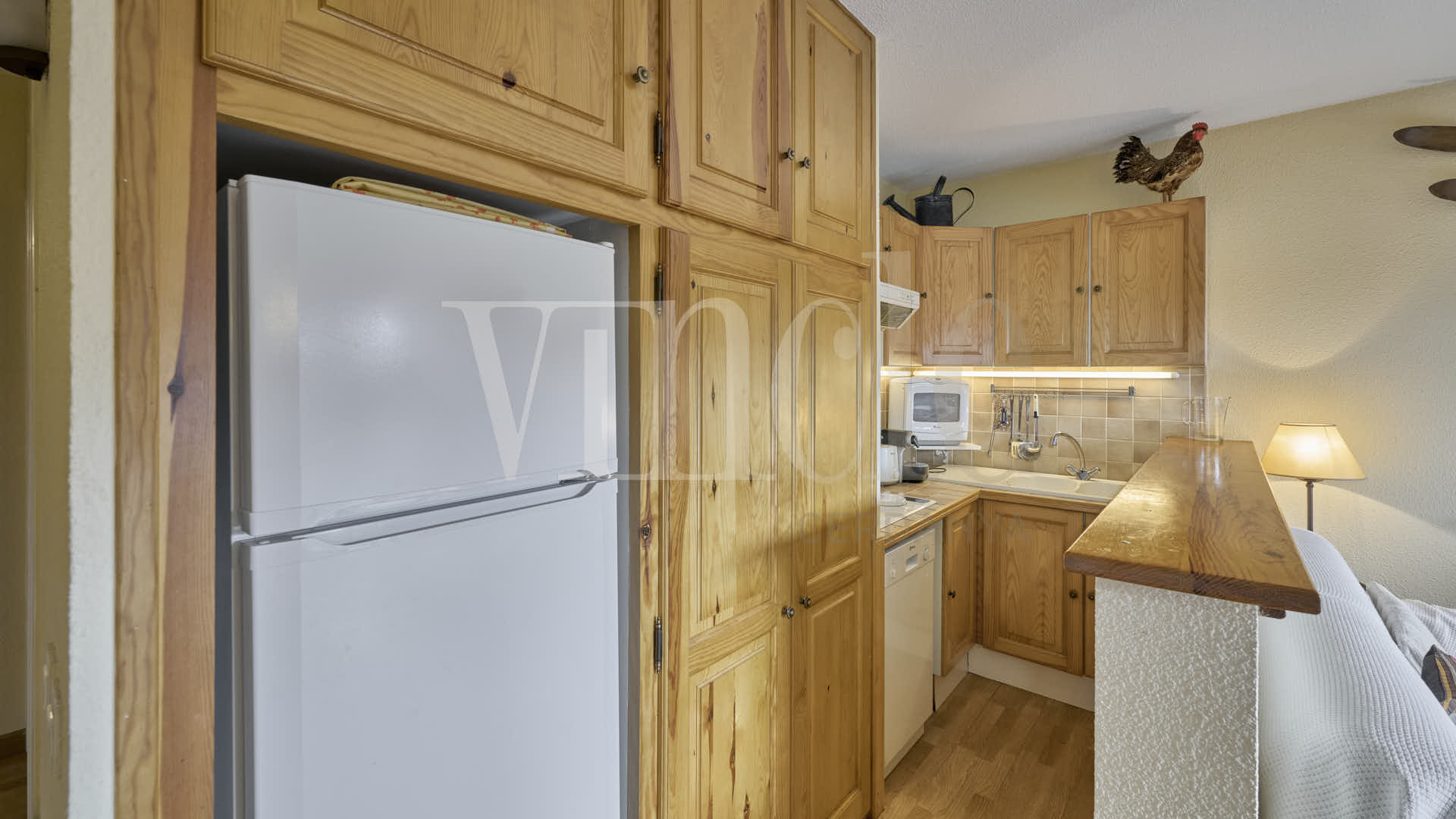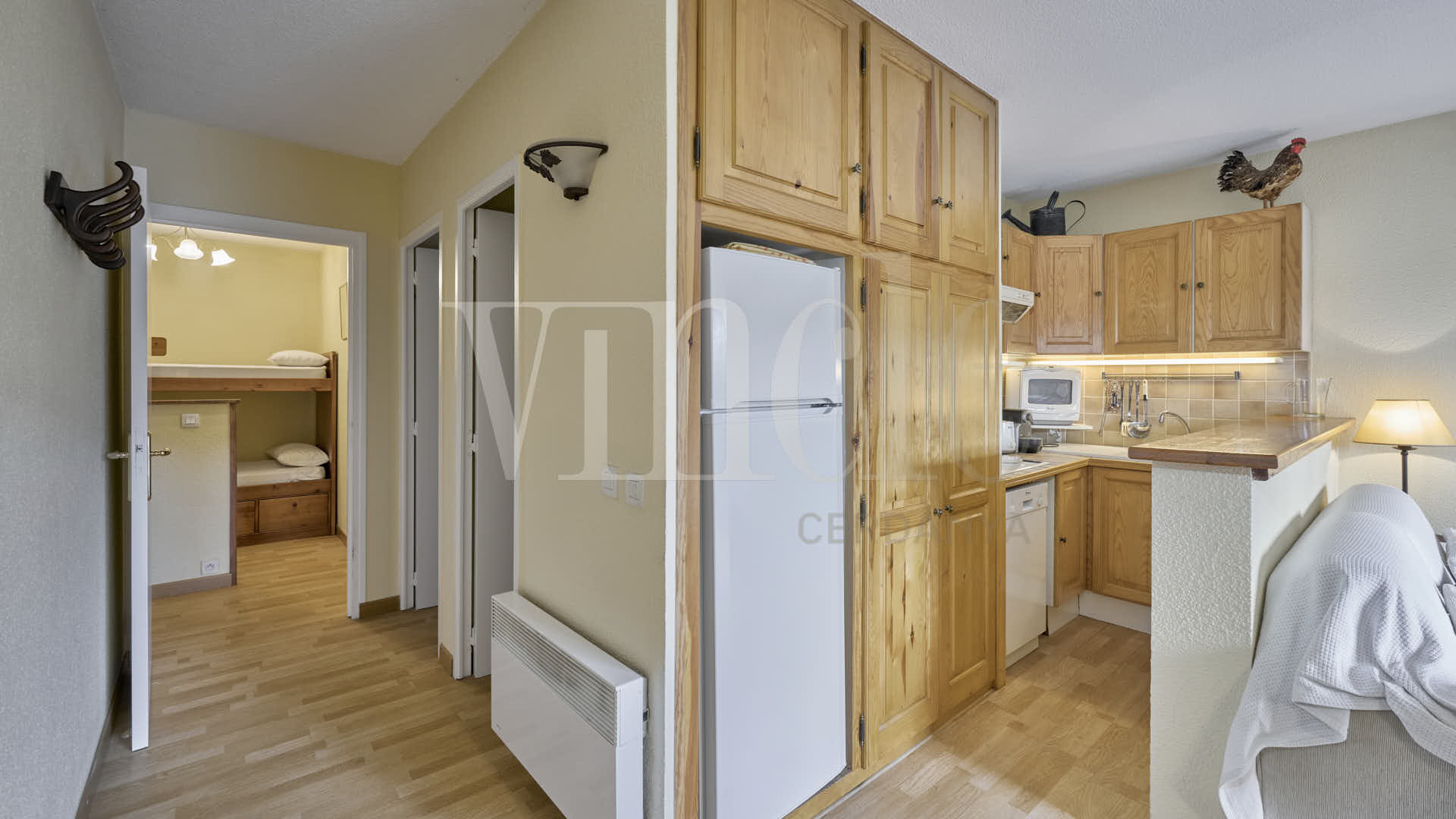 L’habitatge disposa d’una habitació doble, un bany complet amb espai habilitat per a rentadora i assecadora, i una cuina oberta amb barra integrada a la zona de dia.