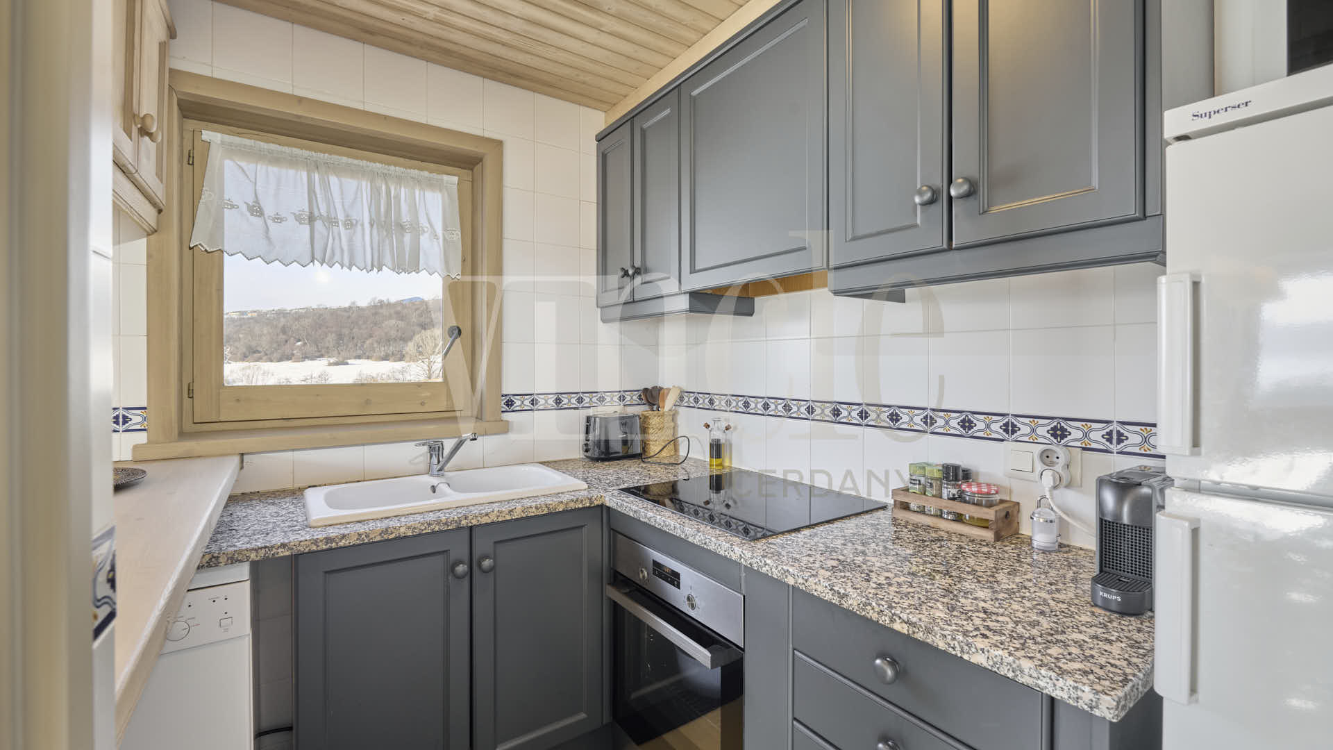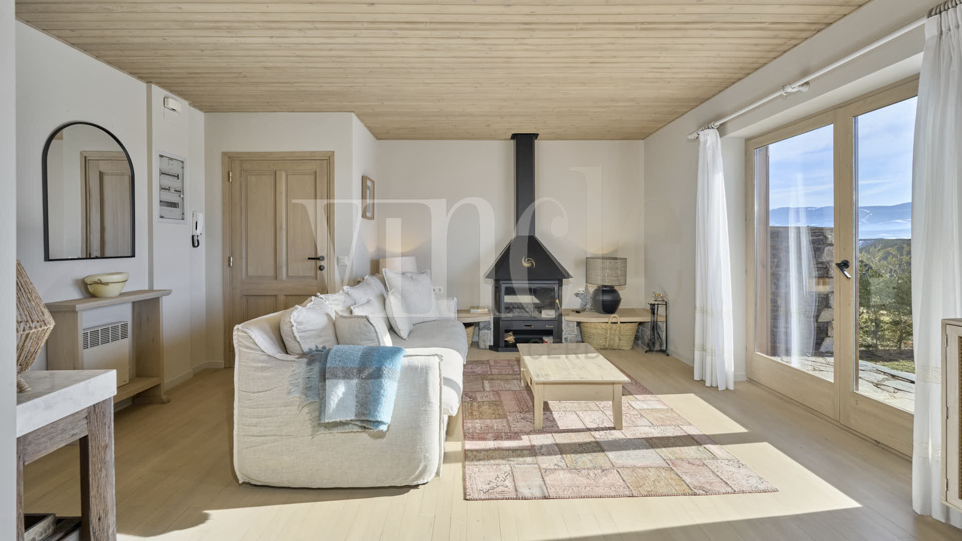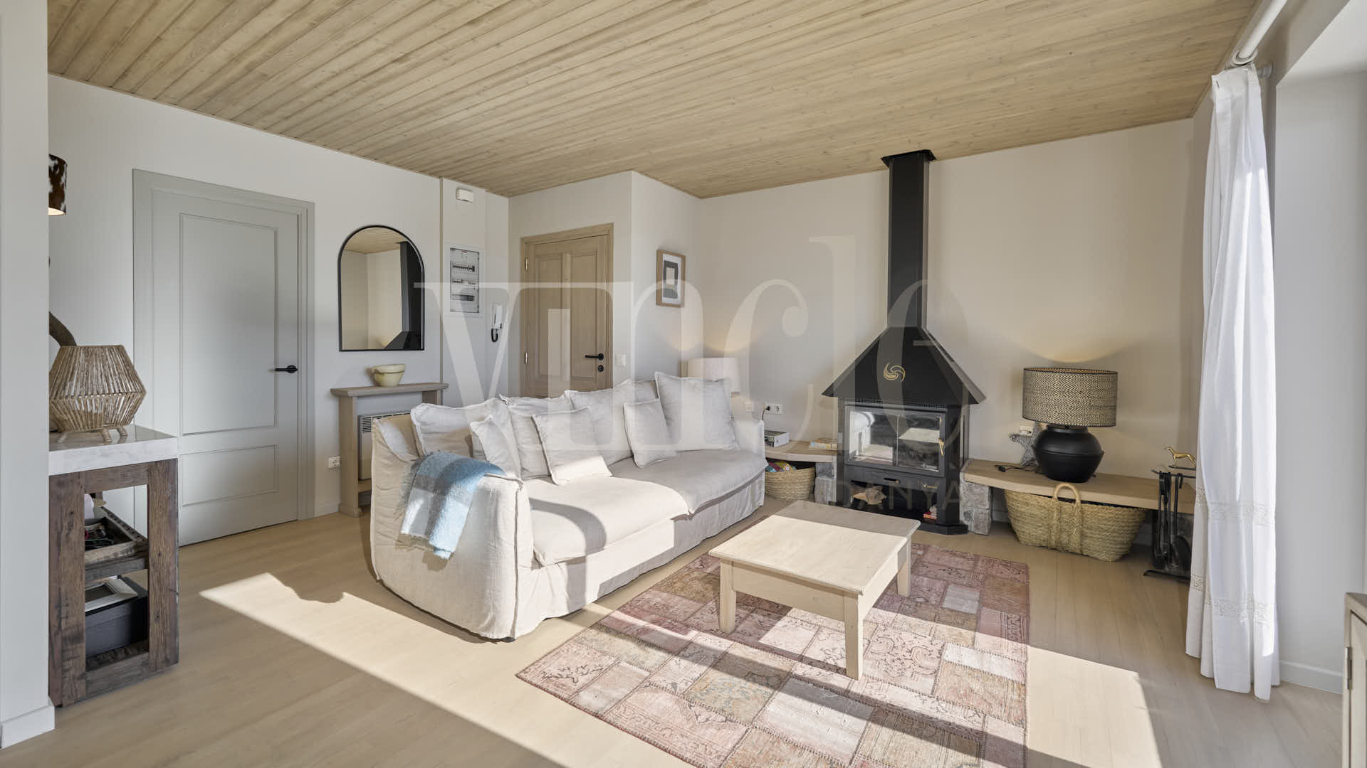 A l’interior, la zona de dia destaca per un saló molt confortable amb llar de foc, que convida al descans. Des d’aquí s’accedeix directament al porxo i al jardí privat, creant una continuïtat natural entre interior i exterior. La cuina, equipada amb passa-plats, s’integra funcionalment amb l’espai de menjador, facilitant el dia a dia.